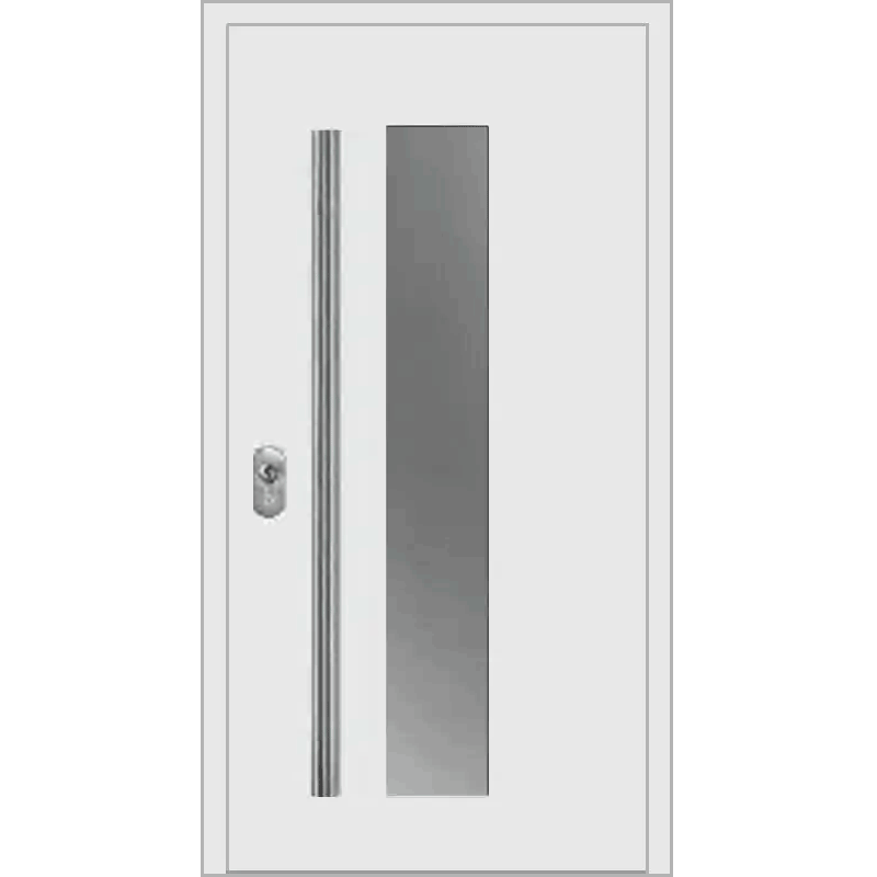 Alle hier gezeigten Türen sind in Verkehrsweiß RAL9016 glänzend, Aufsatzfüllung, runde Edelstahl-Griffstange, auf geraden Stützen, auf der Füllung montiert in 1600mm Länge und ovaler PZ-Rosette in Edelstahl.